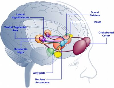 [[File:Ofc2.jpg|thumb|400px| '''Orbitofrontal cortex''' and "basal ganglia," two important regions for pleasure and happiness, situated in the brain.]] | |||