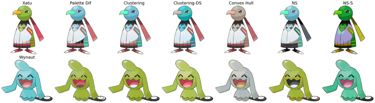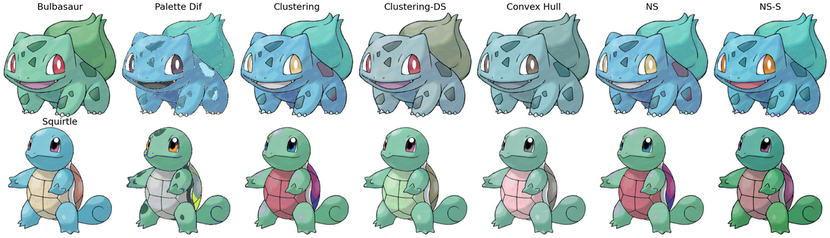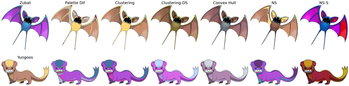 From the quantitative results, several consistent trends emerge. The naive Palette Dif baseline typically yields the largest FID, ΔE, and VGG feature-space distances, indicating substantial shifts in both color appearance and high-level structure. In contrast, methods that explicitly align color distributions—such as Convex-hull transfer and Palette-aware clustering—generally achieve much lower ΔE (CIELAB, CIE94, CIEDE2000) and higher SSIM, reflecting better preservation of Pokémon shapes, shading, and semantic details. The Convex-hull method, in particular, often attains some of the lowest perceptual color differences while still producing convincing stylizations, suggesting that preserving barycentric relationships in palette space is an effective way to constrain recoloring.