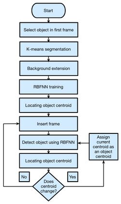 I chose to use as a starting point, the algorithm described in Deshmukh, P. K. & Gholap, Y. (2012). Efficient object tracking using K-means and radial basis function. I include here the abstract from this paper, as well as a flowchart of the algorithm process (that I made, but copied in style from their paper), as it most succinctly describes their algorithm.