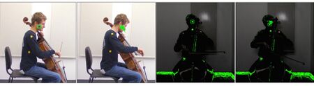 Recording took place in a quiet, secure room. Two Canon Vixia HF R600 were used for video recording: one to the front, at around a distance of 8 ft 10 in, one to the side at 6 ft 3 in, and was filmed at 60 fps. This was the highest frame rate available for this camera. This camera was selected due to discussions with the filmographer for our department that it was a quality under $300 camcorder. Audio was recorded using a Zoom H6, at 96 kHz sampling rate and 24-bit depth. Cellists were lit using a Pro LED 1000 12x12 LED Panel Light. Cellists wore 1-in squares of retroreflective tape, placed at the center of the forehead, the nose, the top of the hands, the center point on the clavicle (below the neck), both shoulders, the lower rib, and the right cheek. Participants were asked to wear dark clothing that was not too loose-fitting.