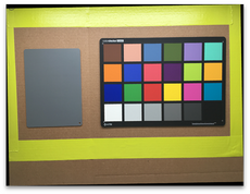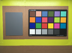 - Color checker + grey card: One X-Rite ColorChecker Classic and one 5.3 in x 7.28 in Anwenk 18% grey card affixed to the cardboard panel. Both were ordered online from Amazon.com.