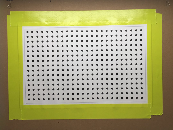 - Grid of dots: A grid of 14 x 22 dots printed on 11 in x 17 in white paper at 1200 dpi. Each dot has diameter 0.12 in and 0.39 in spacing between dots. The dots were located inside of a 10 in x 16 in box with 0.5 in margins on all sides, with a blue outline of width 1 pt. The image target was created in PowerPoint and is attached in Appendix II.