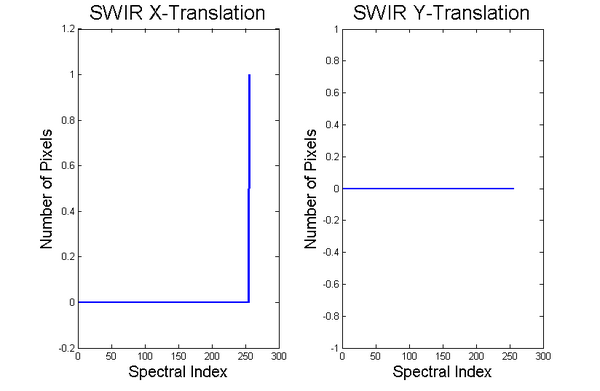 Comparing all the VNIR wavebands to the high SNR VNIR band, we find that there is no misregistration among those bands, as shown in the VNIR crossband registration plots. This is consistent with the claim that any misregistration should be at sub-pixel level. In addition, we also compared all the SWIR wavebands to the high SNR SWIR band and found that misregistration only occurs at the last spectral index with an x-offset of only 1 pixel. This suggests that the SWIR camera is designed to flavor the lower-end spectrum toward 100 nm. It matches our expectation that any misregistration should happen on the edges of the spectrum. The result is mostly consistent with the claim that any misregistration offset should be less than 1 pixel. It would be interesting to examine the root cause of this 1-pixel offset, for it be noise, imperfection in data processing, or other factors.