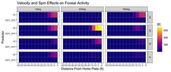 One question that came up during analysis was whether the stronger seam-orientation effects in changeups were actually driven by differences in velocity or spin rate, rather than orientation itself. To check this, I fit models that included angle × spin, angle × velocity, and angle × spin × velocity interaction terms within each 5-ft distance bin. As the heatmap below shows, these interaction terms stayed near zero across all pitch types, with no consistent brightening even in the late-flight region where the main seam-orientation effects appear. This indicates that the retinal sensitivity to seam orientation is essentially independent of spin rate and velocity in this simulation, instead, the effect arises from geometric visibility (i.e., how the seams face the viewer) rather than from dynamic factors like RPM or initial speed.
