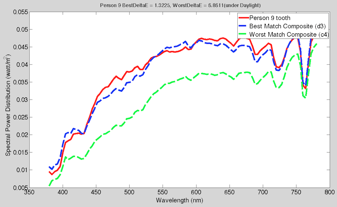 Figure 1 shows spectral power distribution for one of the persons in our experiment, under daylight. We also show the SPD of composite materials which were the best match (Composite d3) and worst match (Composite c4) under daylight. The best case deltaE value is 1.3225 and worst case deltaE value is 6.8611.