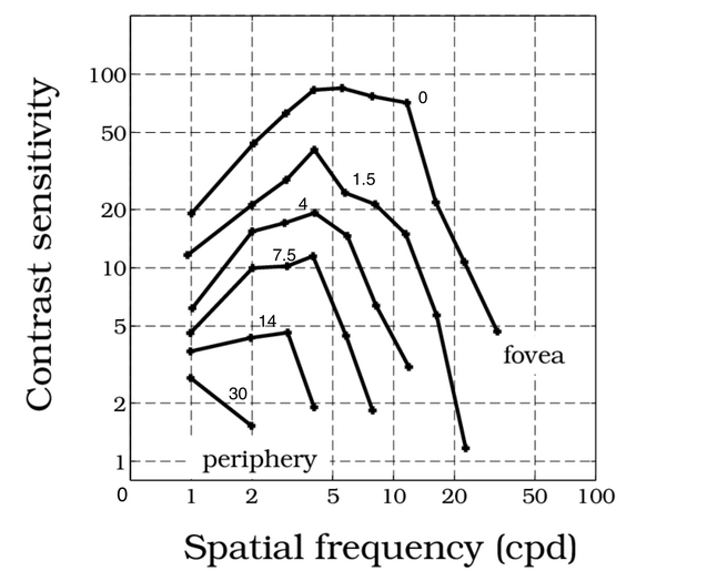 However, human vision adapts quickly to new viewing conditions. Therefore, a single CFS is not enough to describe human pattern sensitivity. By using small sinusoidal grating presented in front of observers within the middle few degrees of the visual field, researchers found that temporal properties, the mean background illuminance background level and the wavelength composition of the stimulus all had great influence on pattern sensitivity. However, if the sinusoidal grating was put on peripheral locations in the visual field, sensitivity decreased. Figure 2 showed the CSF measured at retina eccentricities of 0, 1.5, 4, 7.5, 14 and 30 degrees. The observers’ peak contrast sensitivity reached nearly 100 for gratings near 5-8 cpd and could resolve gratings in about 50 cpd while observers reached limit in 2 cpd when measured in the visual periphery.