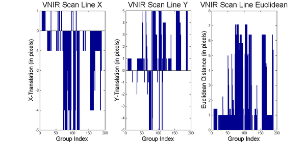 It is also interesting to look at the registration between bands within different groups of scan lines and examine if there is a systematic variation from one end of the the field of view to the other. This amounts to scanning from the top of our image to the bottom and looking at the euclidean offset as a function of scan line. Scan line variations can be analyzed in both the unimodal and bimodal cases. Here we consider groups of 100 scan lines.