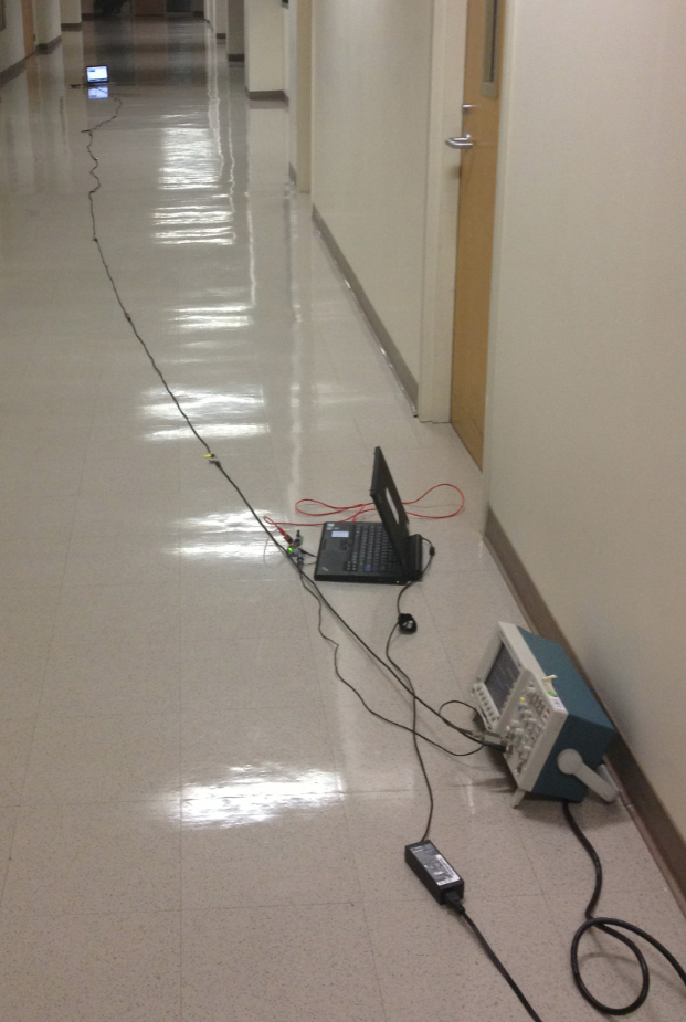 Oscilloscope and very long cable to test distance and delay relationship.