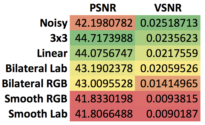 Color-coded table of the PSNR and VSNR values calculated for the various denoising approaches, and for the noisy image itself.