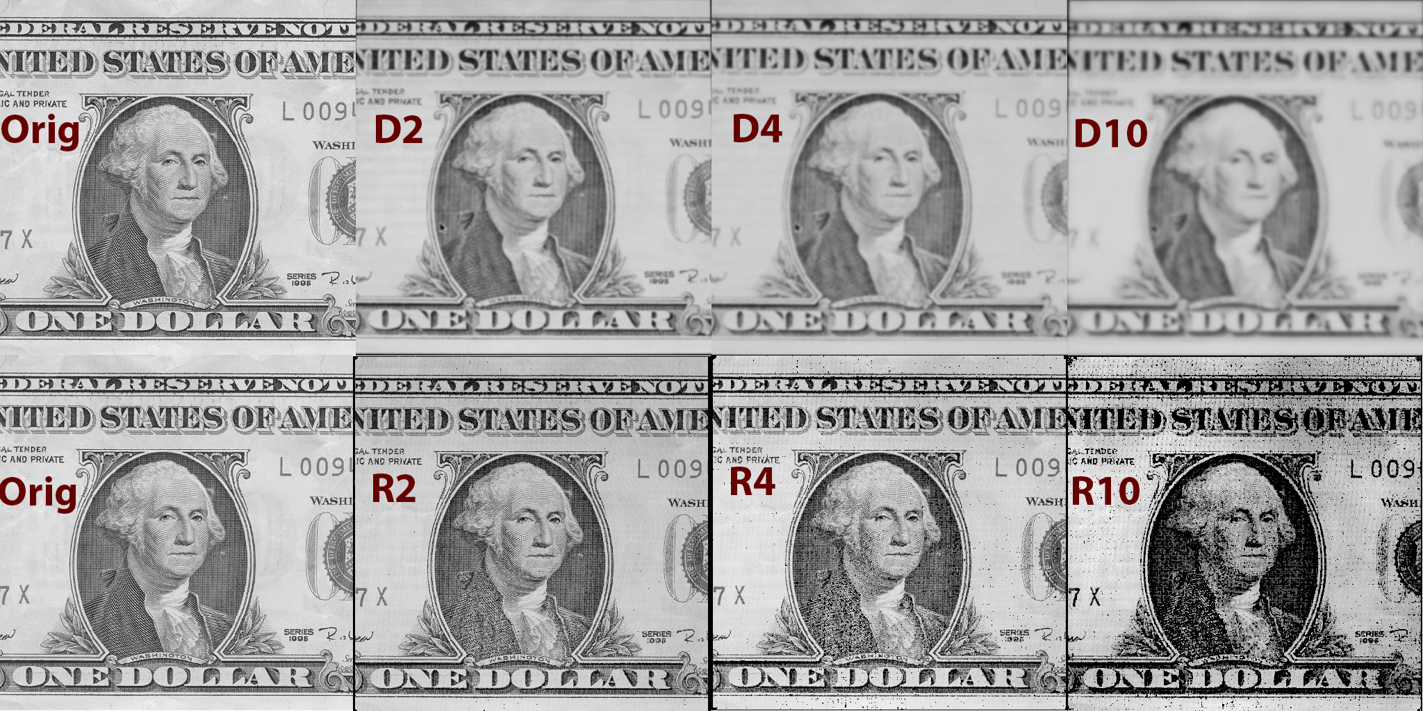 A grid of several images blurred to various extents, versions reconstructed from samples with the same amount of blurring, and the original image for reference.