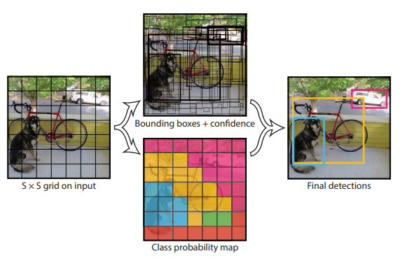 - Single-shot detector: Divides the image into grid cells and predicts bounding boxes + class probabilities.