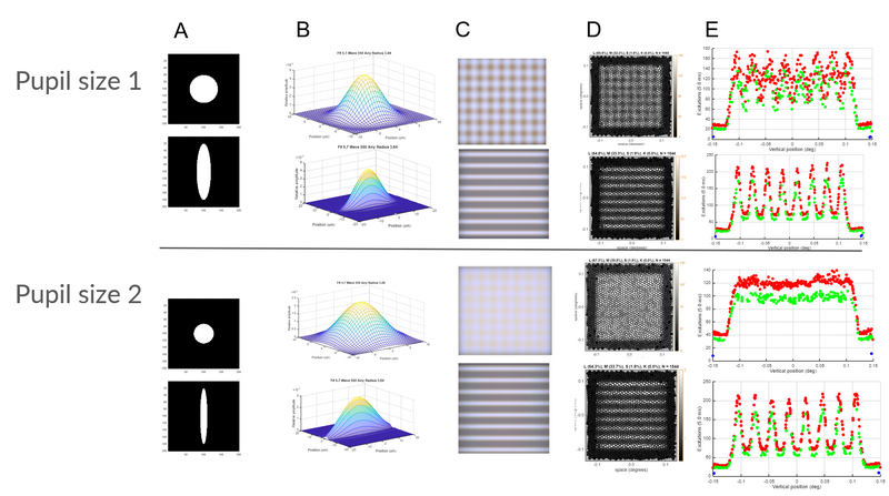 To test the theory that their unique W-shaped pupil produced chromatic aberrations, a custom aperture mask was created and resulting optical image generated with a gridline scene. In the case of a larger pupil size, clear vertical lines and slightly blurred horizontal lines are seen, as expected given its overall horizontal slit-like aspect ratio. Additionally, clear red colour fringing is seen in the vertical lines, supporting this theory that one purpose of their unique pupil shape is to produce chromatic aberrations on their cone mosaic.